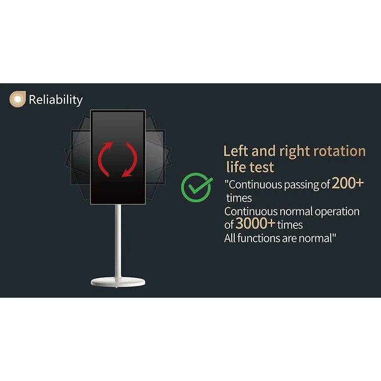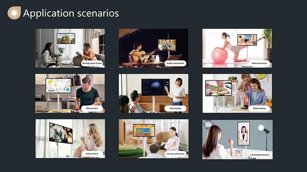 تشير شاشة الهاتف المحمول الذكية هنا إلى شاشة العرض الاحتياطية، باستخدام تقنيات عالية التقنية، مثل حساسية اللمس العالية والدقة العالية وجودة الصوت عالية الوضوح والاتصال اللاسلكي وما إلى ذلك، لجعلها تحتوي على صور واقعية وممتعة جودة الصوت. وهناك بكرات مثبتة أسفل قاعدتها، بحيث يمكن تحريكها بشكل جيد للغاية في المنزل ويمكن استخدامها في المطبخ، وغرفة الدراسة، وغرفة النوم، وغرفة المعيشة، وما إلى ذلك. كما يمكن أخذها في الهواء الطلق من خلال بطاريتها المدمجة. للاستمتاع بالموسيقى ومقاطع الفيديو، مريحة للغاية.